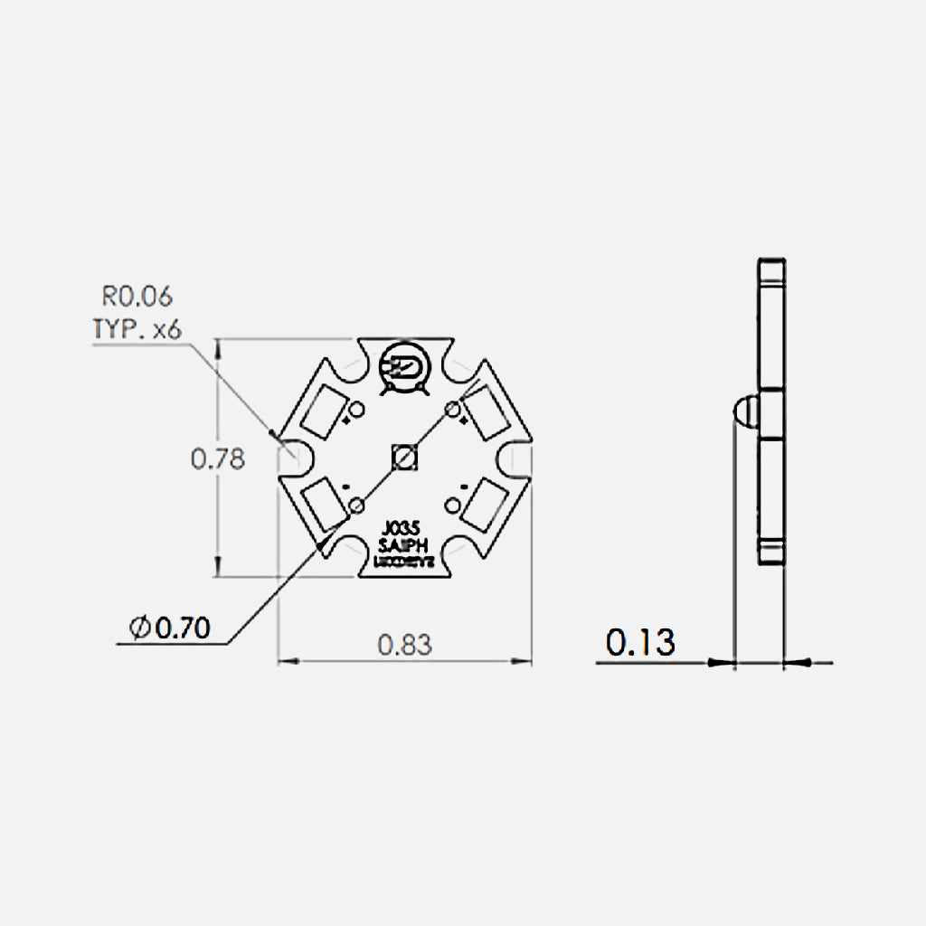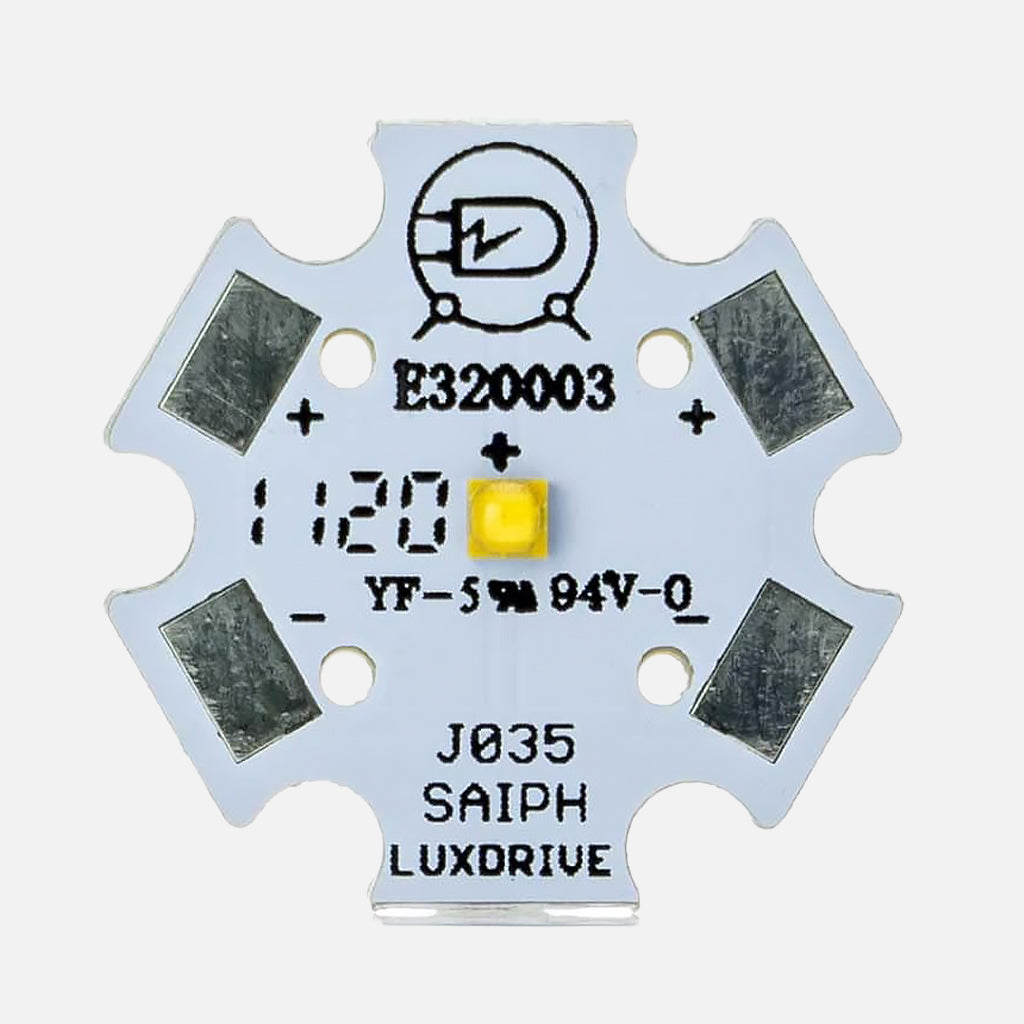 The Saiph Star J035 combines high brightness with ease of integration into fixtures and OEM applications.The LUXdrive™ Saiph Star features the Luxeon C emitter in a singular 1-up design on a 20mm star board. Inherent electrical isolation means thermal interface materials are not required to be electrically insulative. LEDdynamics strives to use the highest flux bins that are most readily available, please contact us if you require a specific bin.